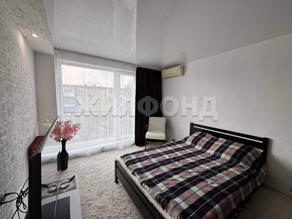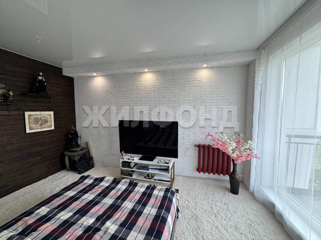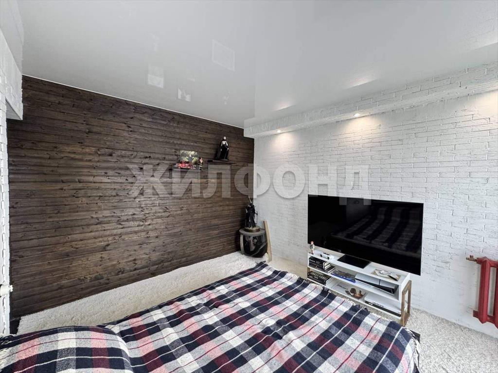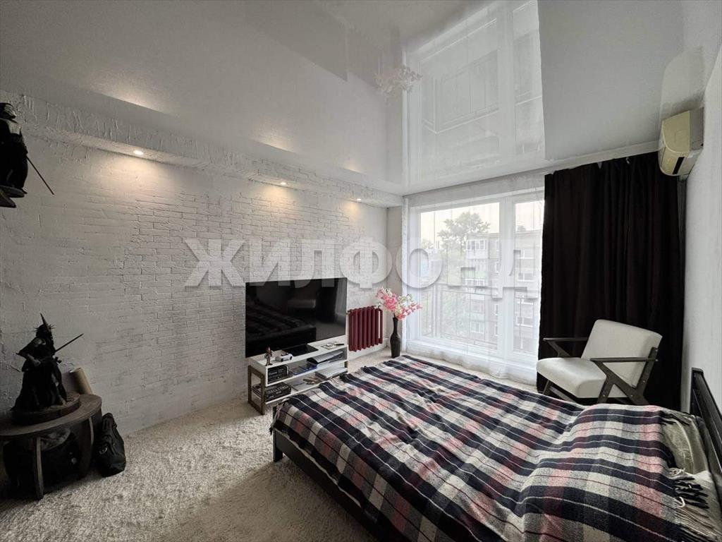 В спальне -натяжной потолок, на полу ковровое покрытие.